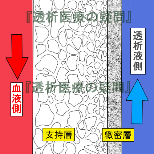 グラジエント構造の逆の構成になっており,血液側に支持層,透析液側に緻密層の構成になっている。溶質の透過抵抗は小さいが,目詰まりが多いのが特徴。